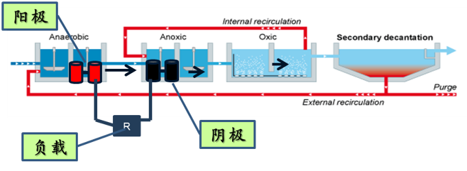 MFC同步的脫氮除碳—陽極利用微生物去除有機(jī)物產(chǎn)生電子,同時(shí)在陰極(生物陰極)利用硝酸鹽還原菌催化硝酸鹽還原,從而實(shí)現(xiàn)在去除有機(jī)物的同時(shí),脫去污水中的氮。